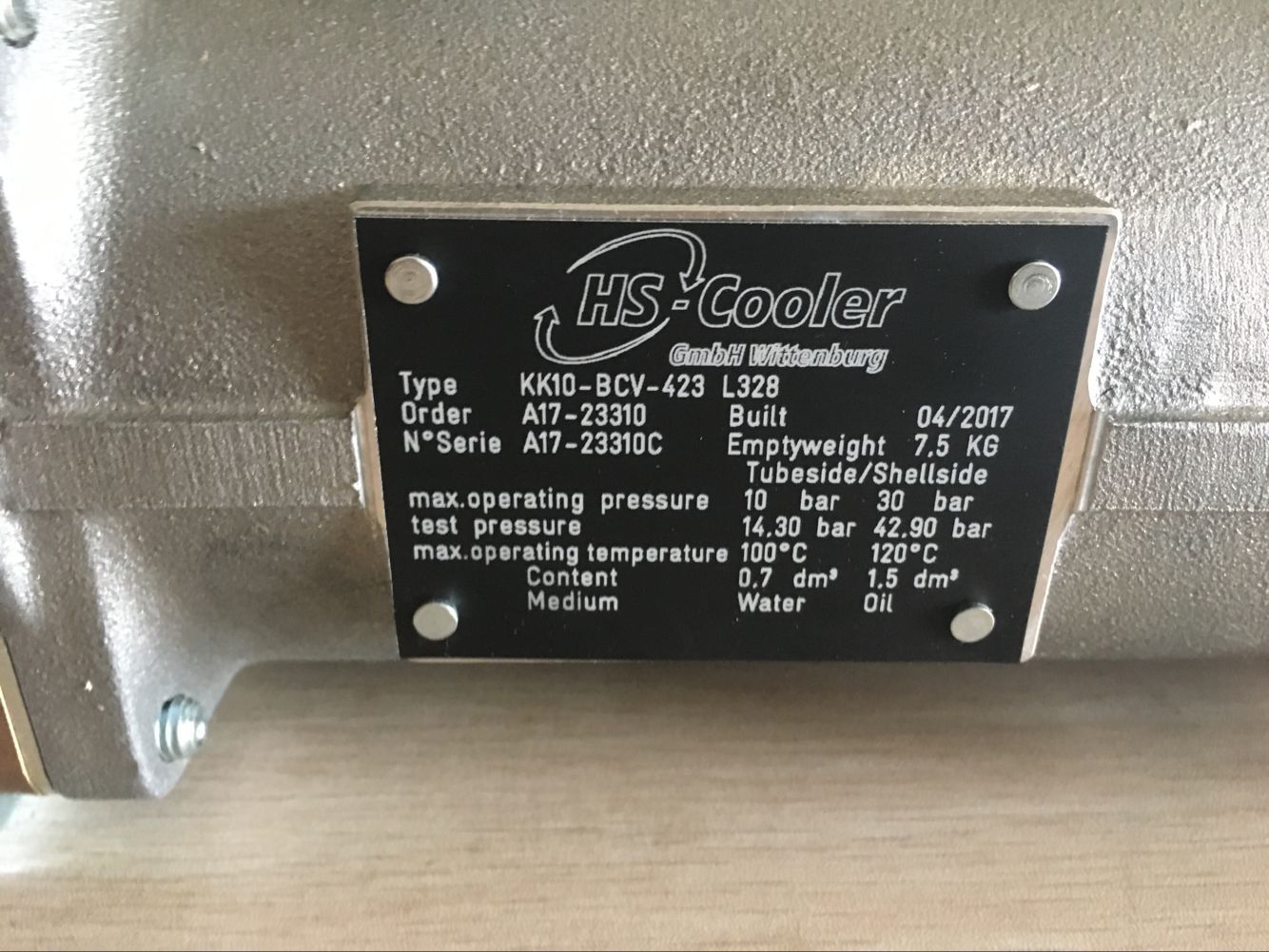 冷卻器KK10-BCV-423/L328MPa。備注:最大工作壓力:管程10bar,殼程30bar,品牌:德國(guó)HS-COOLER